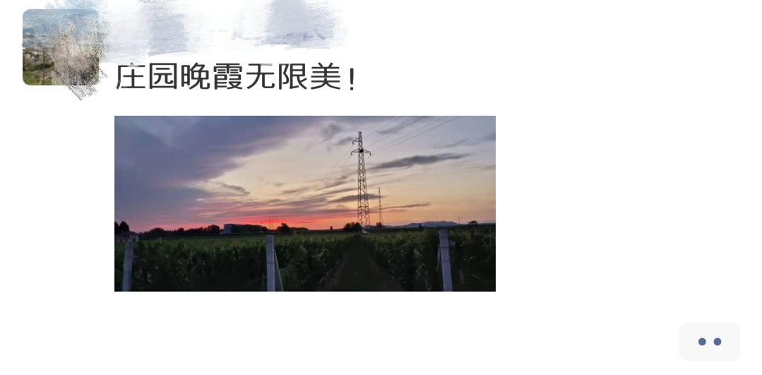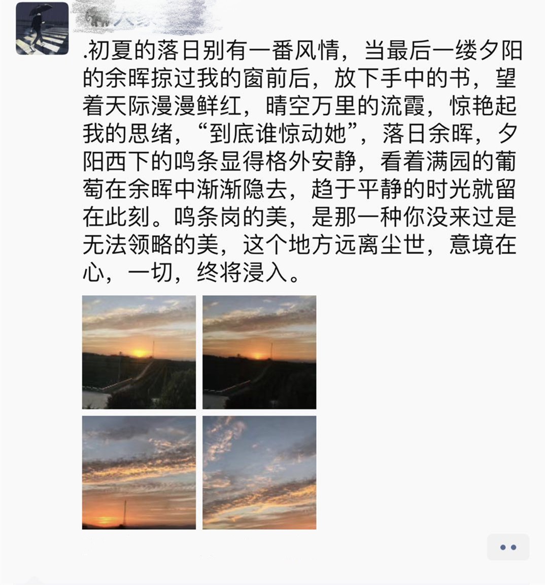 夏日的晚霞別有一番風(fēng)情,當(dāng)最后一縷夕陽的余暉掠過窗前,放下手中的書,望著天際漫漫鮮紅,晴空萬里的流霞,驚艷起我的思緒,“到底誰驚動了她”,落日余暉,夕陽西下的鳴條顯得格外安靜,看著滿園的葡萄在晚霞中漸漸隱去,趨于平靜的時光就留在此刻。鳴條崗的美,是那一種你沒來過是無法領(lǐng)略的美,這個地方遠離塵世,意境在心,一切,終將浸入。
