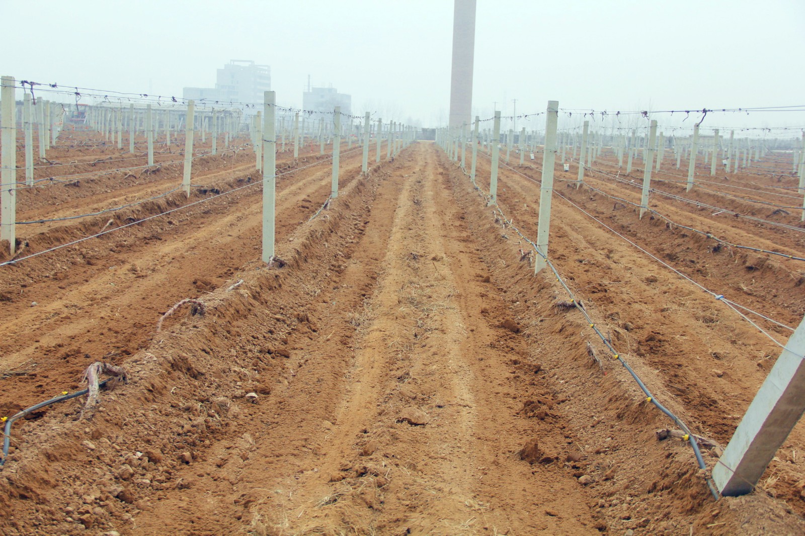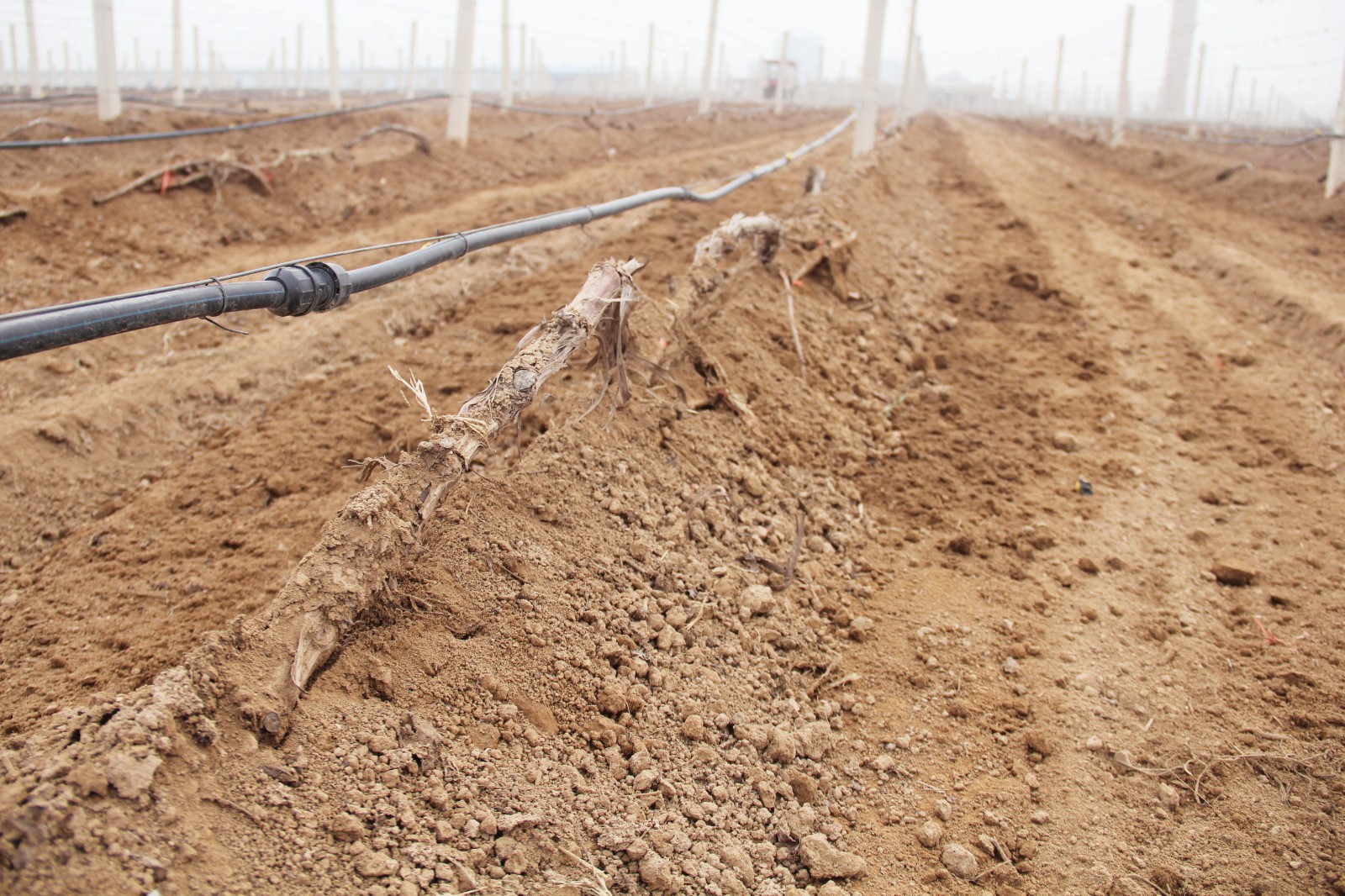 沒有埋土的葡萄樹,工人們修剪之后,用繩子將它固定在鐵架上,然后在葡萄樹根部進行滴灌,此時澆水主要是讓葡萄樹吸收足夠的營養(yǎng),為今年的生長結(jié)果打下基礎(chǔ)。