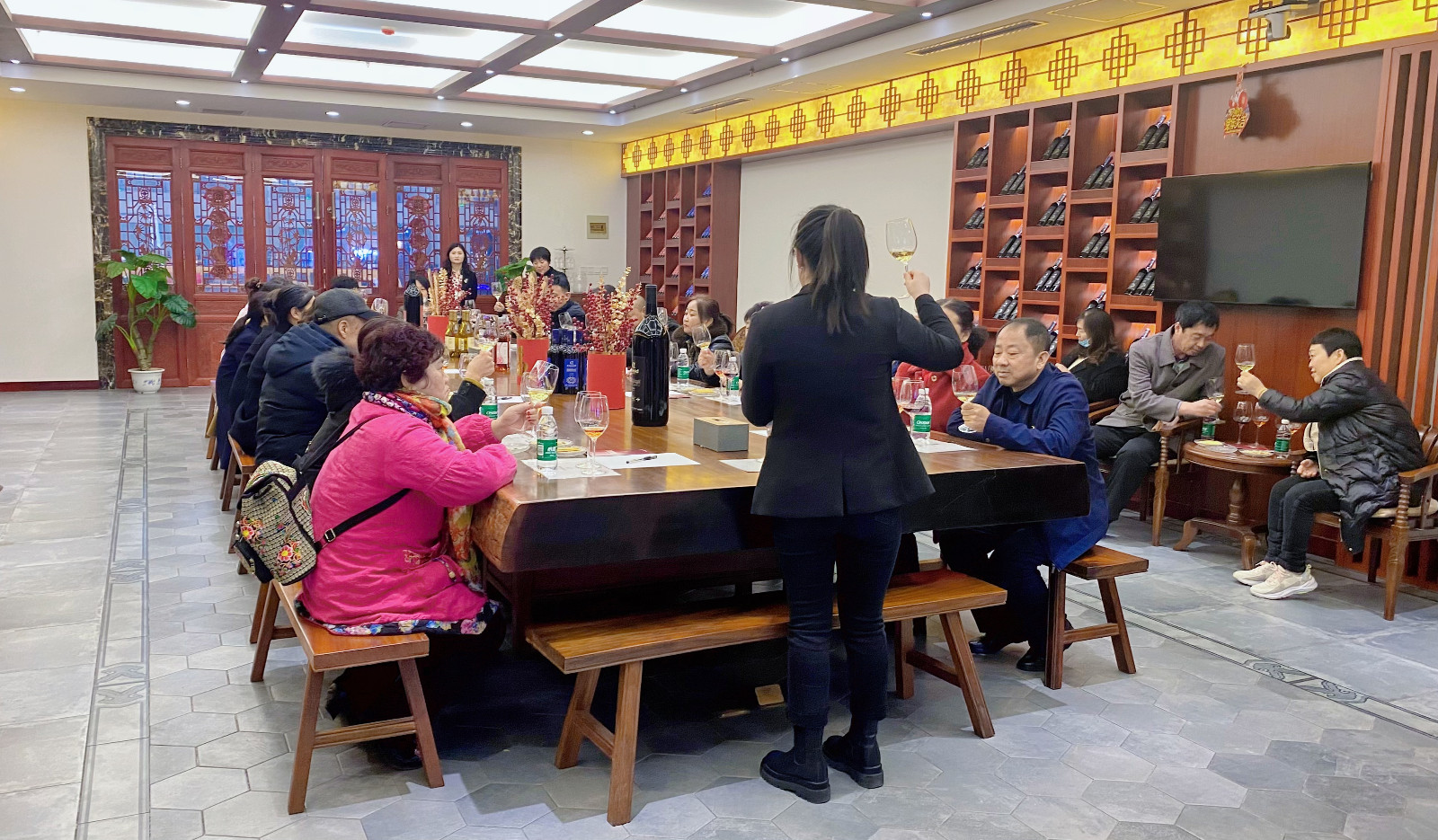 參觀完地下酒窖,進(jìn)入中式品鑒室。品味紅酒,是一種享受,持杯、觀色、聞香、品嘗都有一系列嚴(yán)謹(jǐn)?shù)囊?guī)則,在專業(yè)品鑒師的講解下,更深入地去品味紅酒。
